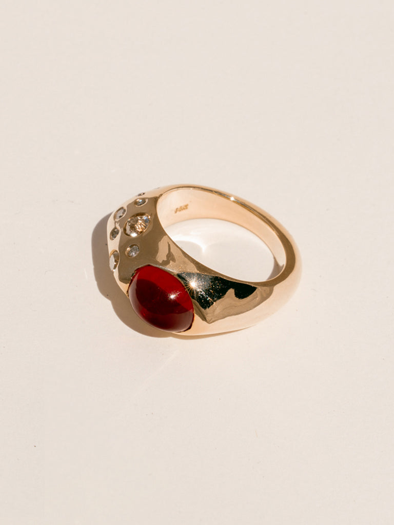 Handcrafted dome ring, featuring a red cabochon garnet and reclaimed antique old cut and single cut diamonds, flush-set in your choice of 14k or 18k Fairmined Eco Certified yellow gold.
